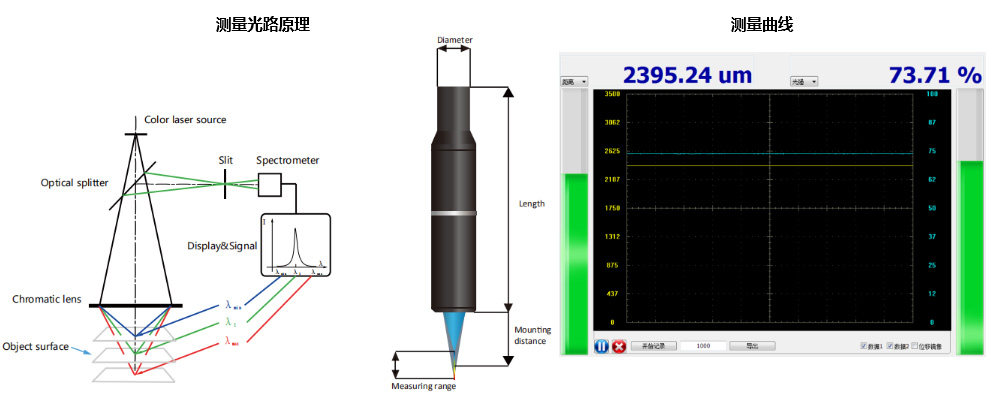 1. The color laser source emits a beam of high density and wide spectrum light. After passing through the dispersive lens, monochromatic light with different wavelengths is formed in the range, and each wavelength corresponds to a distance value. Only the light meeting the confocal condition can be sensed by the spectrometer through the small hole. The distance value can be obtained by calculating the wavelength of the focus of the sensed light.